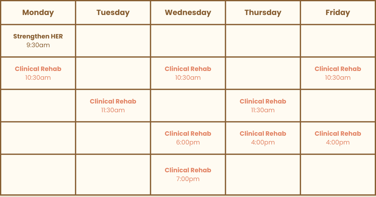 Strengthen HER Classes are designed to help women feel strong, confident, and capable as they return to exercise. Whether you’re rebuilding after pregnancy, managing an injury, or just wanting to feel better in your body, these classes provide a safe, supportive space to regain strength at your pace - no pressure, no judgment.